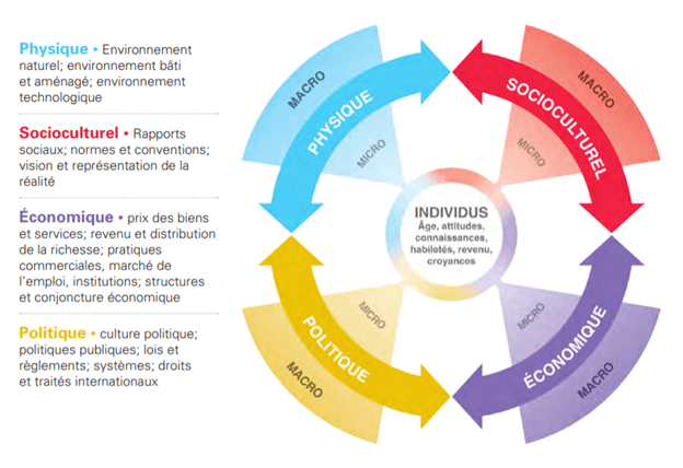 Les saines habitudes de vie ne relèvent pas seulement de la volonté ou de la compétence individuelle. Elles sont hautement dépendantes de l’environnement et du milieu de vie. Il s’agit rendre les choix sains plus faciles à faire. On parle de créer des ENVIRONNEMENTS FAVORABLES à la santé et au bien-être.